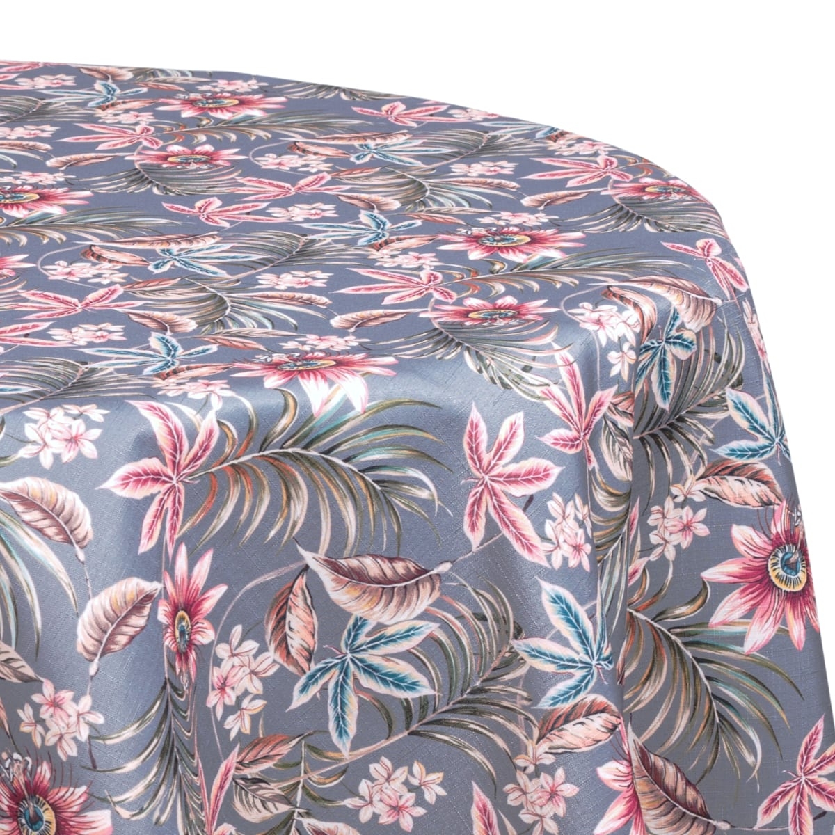 Przepiękny obrus uszyty z plamoodpornej tkaniny o gramaturze 170/m2, z miękkim chwytem. Deseń tworzą kwiaty na szarym tle.