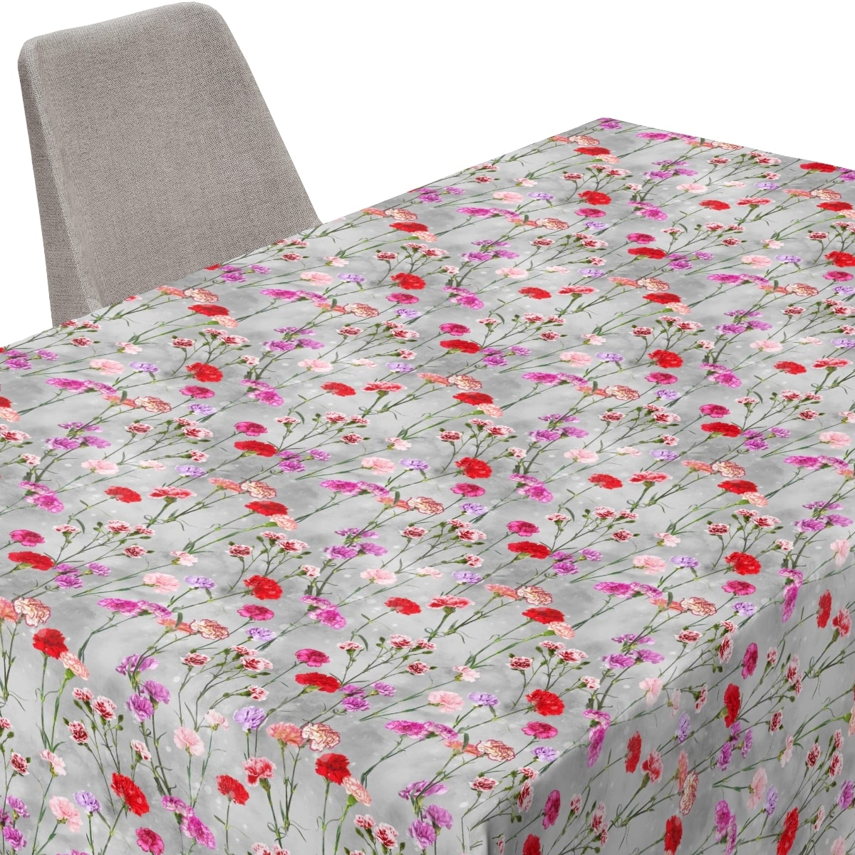 Przepiękny obrus uszyty z plamoodpornej tkaniny o gramaturze 230g/m2, z miękkim chwytem. Szare tło zadrukowane jest kolorowymi goździkami, które dodadzą uroku każdemu stołowi.