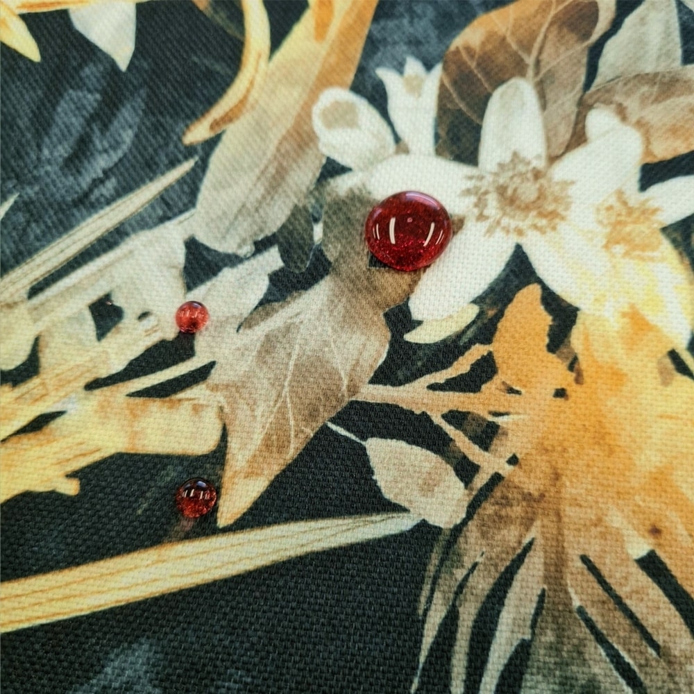 Jest to obrus plamoodporny - po wylaniu płynów ciecz zamiast wsiąkać w tkaninę tworzy kropelki na powierzchni obrusa, które w szybki i łatwy sposób można zebrać chusteczką.