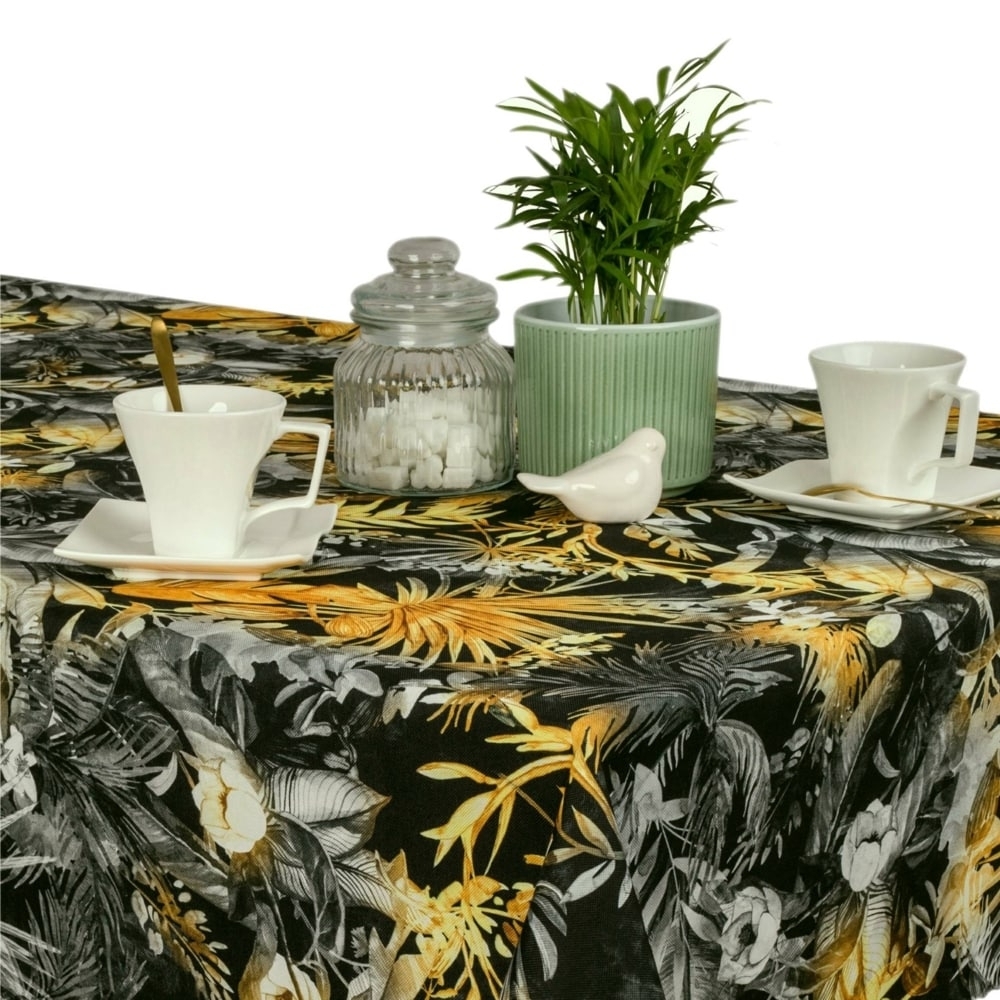 Przepiękny obrus uszyty z plamoodpornej tkaniny o gramaturze 230/m2, z miękkim chwytem. Deseń tworzą kwiaty na ciemnym tle.
