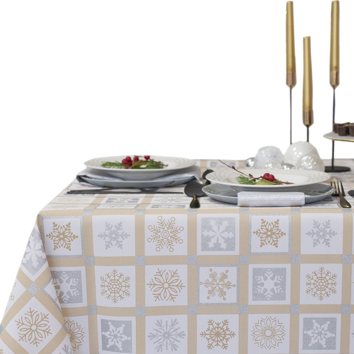 Obrus świąteczny bożonarodzeniowy Elbrus BN-231-A3 beżowo-srebrny jest wykonany z tkaniny Elbrus wykończonej apreturą plamoodporną. Obrus ten składa się z 100% poliestru. Zadruk wzorem ze śnieżynkami.